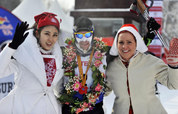 2012年1月2日,瑞典選手霍格博格(中)在賽后與瓦薩天使合影。當日,2012中國長春凈月潭瓦薩國際越野滑雪節在長春舉行。在男子傳統52.5公里比賽中,瑞典選手霍格博格以2小時23分02秒的成績奪得冠軍。新華社記者 王昊飛 攝