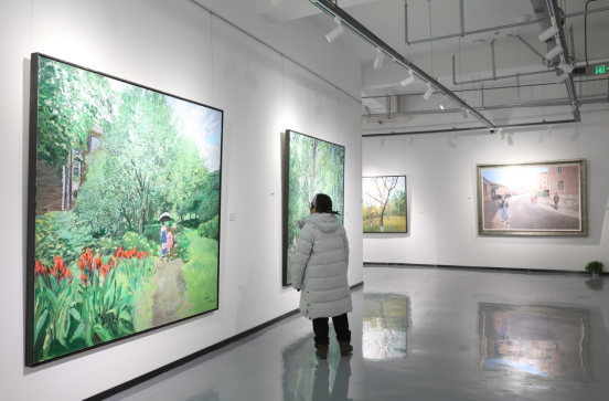 1月10日,一位參觀者正在參觀《四季長春王建國老師油畫展》。