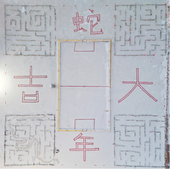 冰上游藝區,四角四區是用玉米秸稈搭建的冰上迷宮區,和中間區域的“打冰棺”區構成五區,取中國傳統新年中的“福祿壽喜財”吉祥之意,加上東南西北“蛇年大吉”四區,現場共分九個區域,象征“九州同慶”之意?;顒又姓故玖硕鼗〖壏沁z名錄項目“傳統冰上游藝”的滿族冰上打冰棺(俗稱打棺材臉子)、滿族冰上滑爬犁(滿語稱法喇)、滿族冰上滑冰車(俗稱單腿驢)、滿族冰上抽冰猴(俗稱冰嘎)等項目,讓大家感受到了傳統冰上運動的獨特魅力。