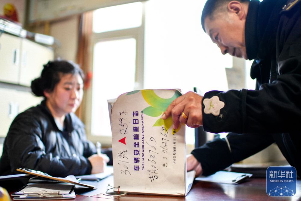 1月17日,林廣松(右)出車前提交當日車輛安全檢查日志。