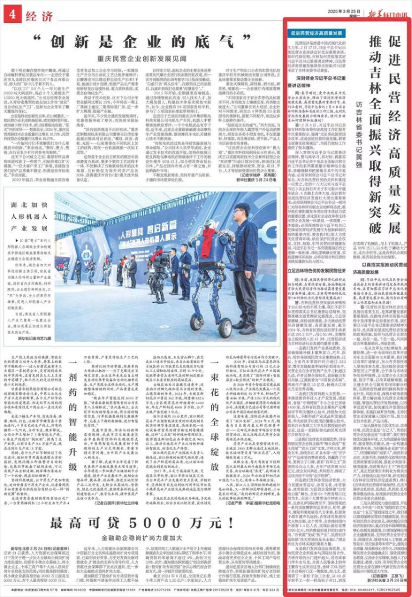 3月25日,人民日報、新華社、中央廣播電視總臺《新聞聯播》、經濟日報分別以促進民營經濟高質量發展為主題,專訪吉林省委書記黃強,圍繞深刻領會習近平總書記重要講話精神、立足吉林特色優勢發展民營經濟、以真招實招推動民營經濟高質量發展三方面刊發報道。