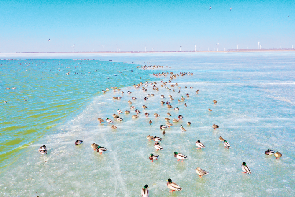 ★日前,隨著天氣轉暖,南飛的候鳥提前回到查干湖,在冰水交融的湖面上振翅飛舞、嬉戲覓食,勾勒出一幅靈動的早春生態畫卷。