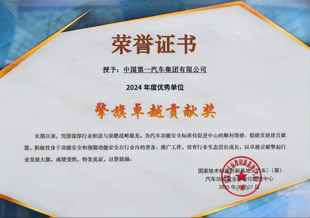 日前,在汽車功能安全標準化促進中心2024年度工作會議上,中國一汽憑借其在汽車功能安全領域的突出貢獻,被授予多項榮譽。其中,中國一汽榮獲“2024年度優秀單位”稱號,TG3-乘用車半主動懸架、全主動懸架系統功能安全開發案例項目組榮獲“2024年度優秀項目組”稱號。