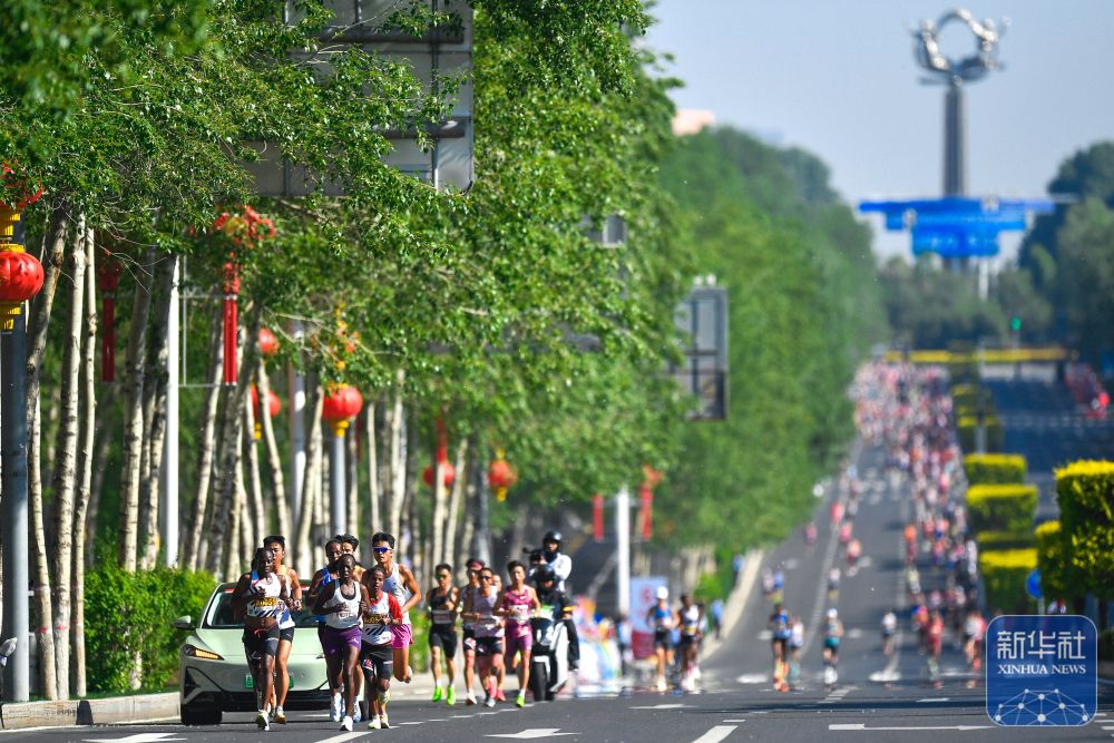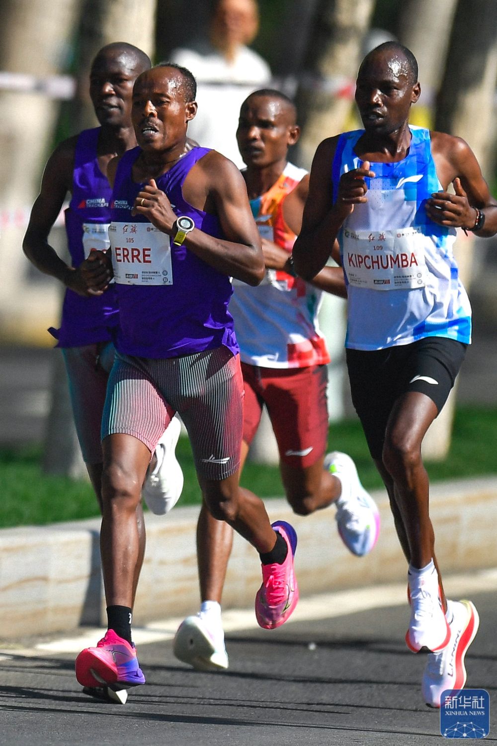 ↑埃塞俄比亞選手塞博卡·內古斯·埃爾(前左)在比賽中,他以2小時12分43秒的成績獲得馬拉松男子組冠軍。新華社記者 許暢 攝