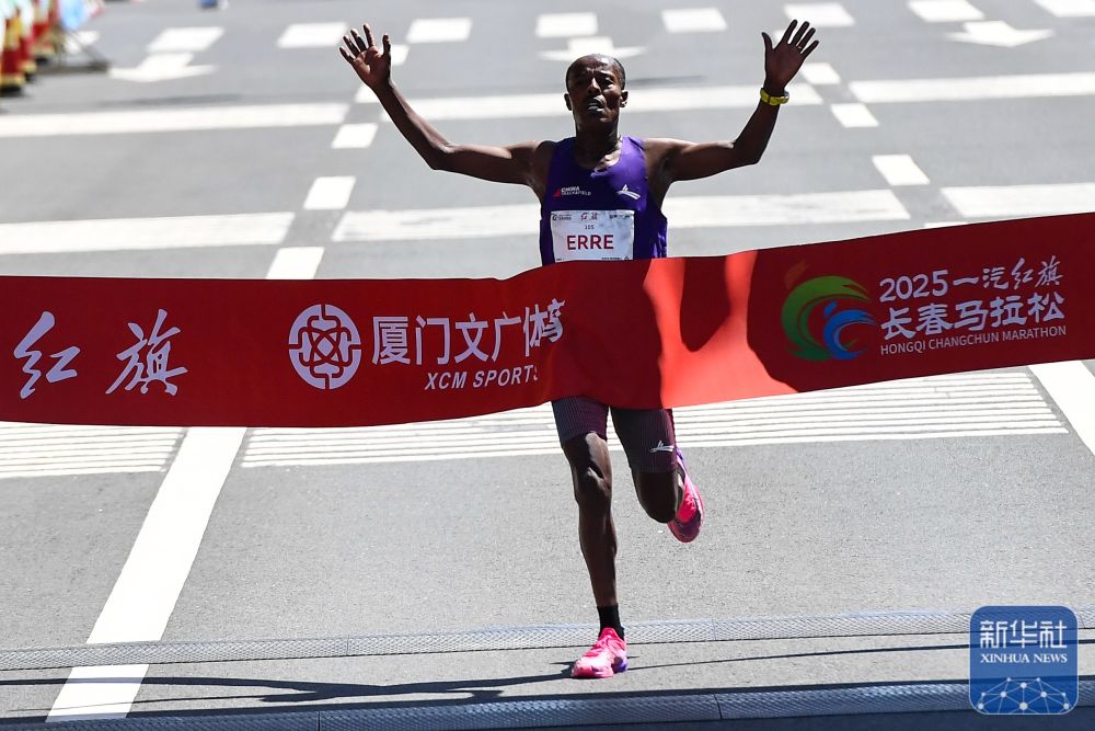 ↑埃塞俄比亞選手塞博卡·內古斯·埃爾在比賽中沖線,他以2小時12分43秒的成績獲得馬拉松男子組冠軍。新華社記者 張楠 攝
