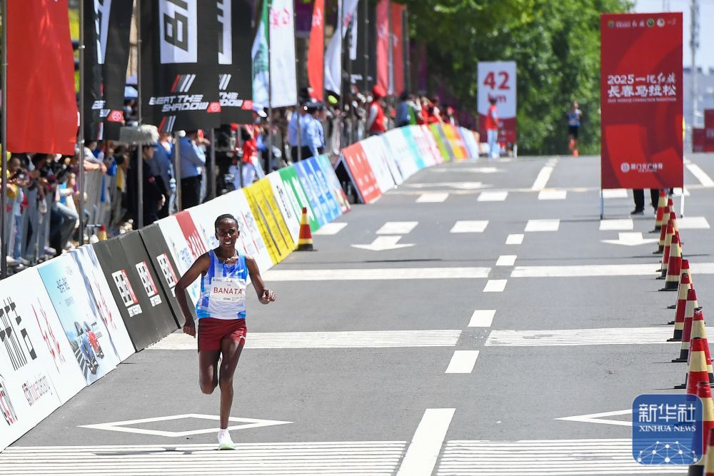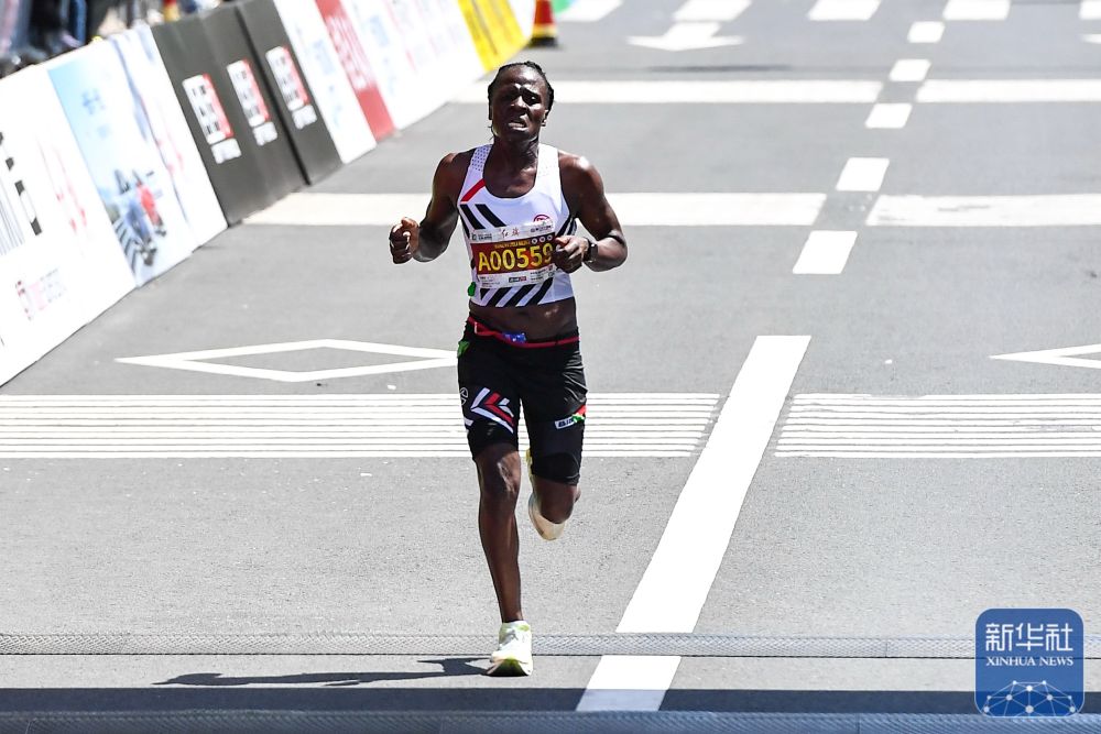 ↑肯尼亞選手瓦馬盧瓦·呂德拉·納利亞卡在比賽中沖線,她以2小時37分04秒的成績獲得馬拉松女子組亞軍。新華社記者 張楠 攝