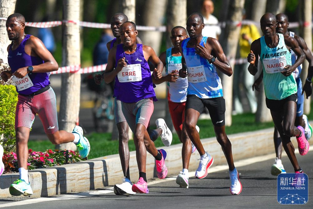 ↑埃塞俄比亞選手塞博卡·內古斯·埃爾(左三)在比賽中,他以2小時12分43秒的成績獲得馬拉松男子組冠軍。新華社記者 許暢 攝
