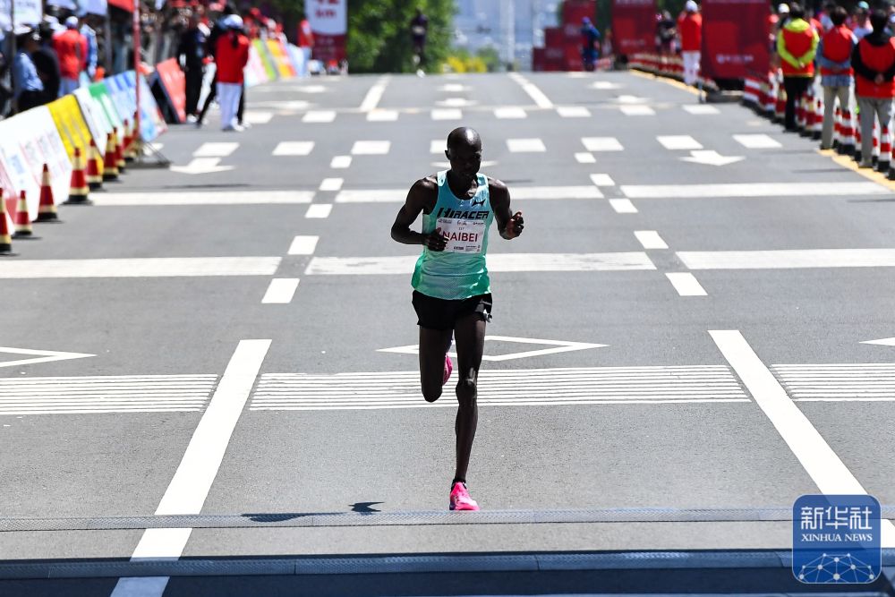 ↑肯尼亞選手肯尼迪·奎莫伊·納伊貝在比賽中沖線,他以2小時13分45秒的成績獲得馬拉松男子組季軍。新華社記者 張楠 攝