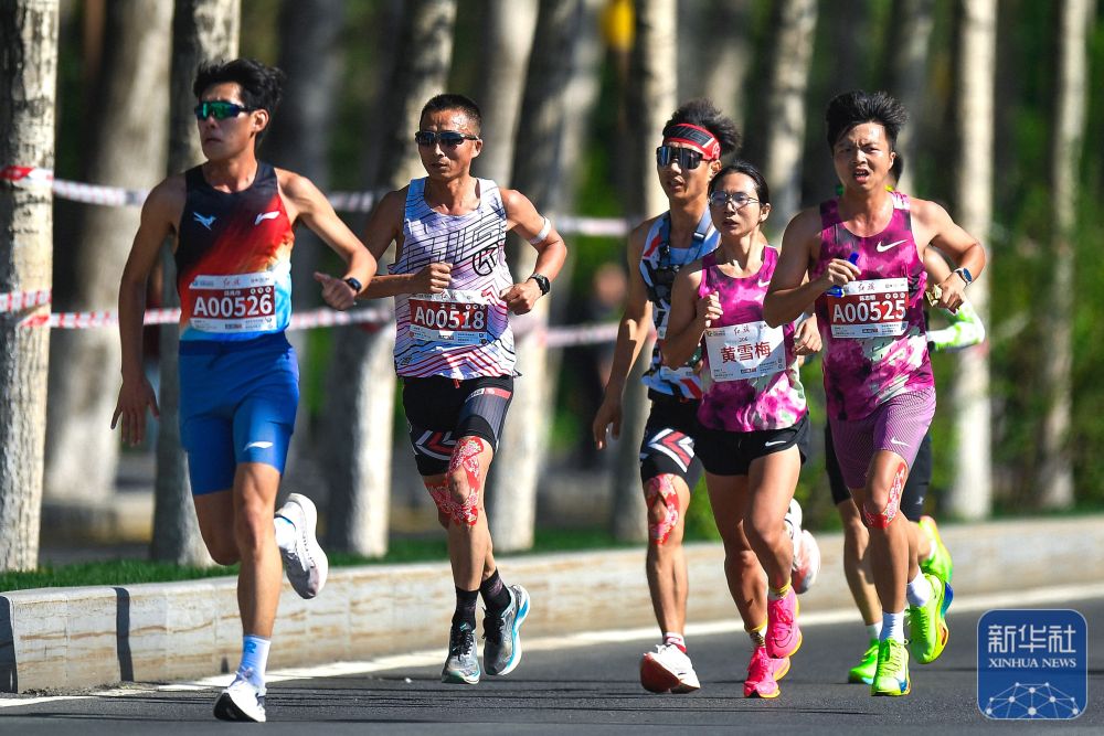 ↑中國選手黃雪梅(右二)在比賽中,她以2小時33分48秒的成績獲得馬拉松女子組冠軍。新華社記者 許暢 攝