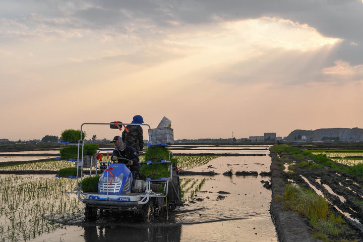 5月26日,在吉林省吉林市永吉縣鑫豐種植農民專業合作社,農民駕駛農機進行水稻插秧。
