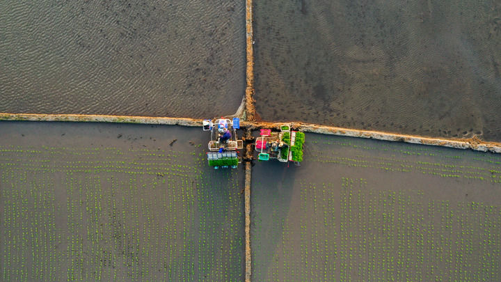 5月26日,在吉林省吉林市永吉縣鑫豐種植農民專業合作社,農民駕駛農機進行水稻插秧(無人機照片)。