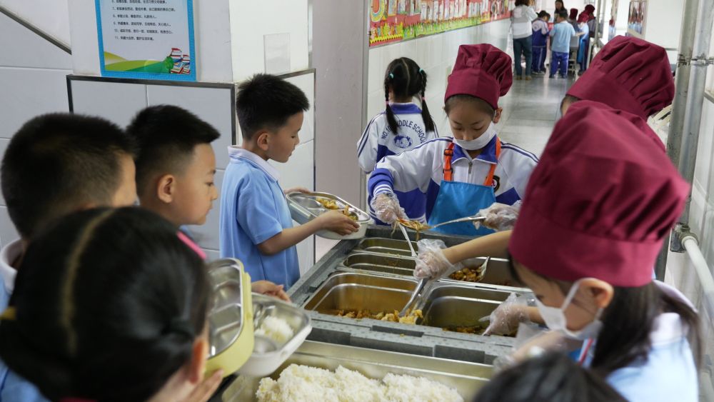 有的學校加強食育教育,讓班級學生們參與分餐工作,培養孩子的自理能力;有的學校升級改造食堂,將餐廳就餐和“桶餐”進班結合起來,優化供餐方式;有的學校改進了食堂文化,全面加強安全飲食、科學膳食的宣傳教育……