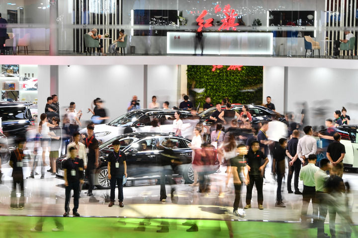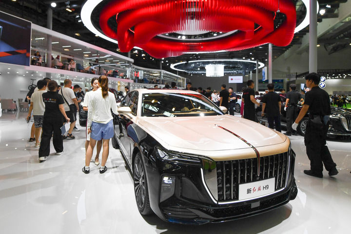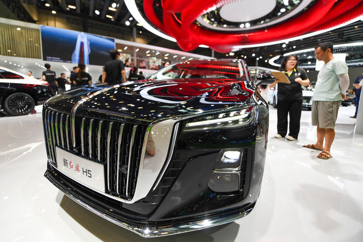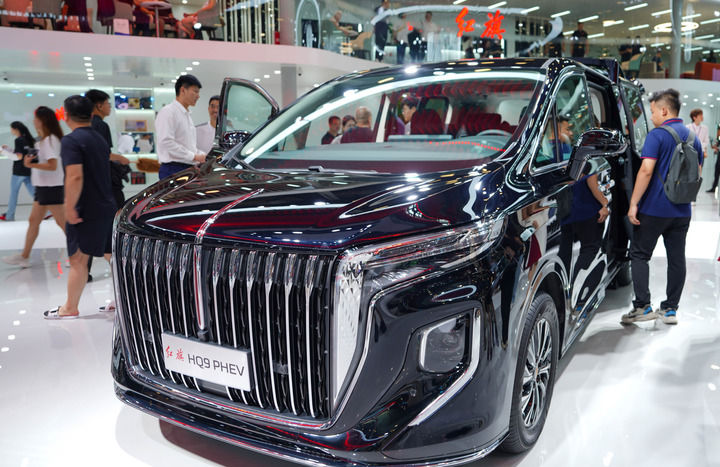 7月12日,游客在第22屆長春國際汽車博覽會紅旗品牌展區參觀。新華社記者 顏麟蘊 攝