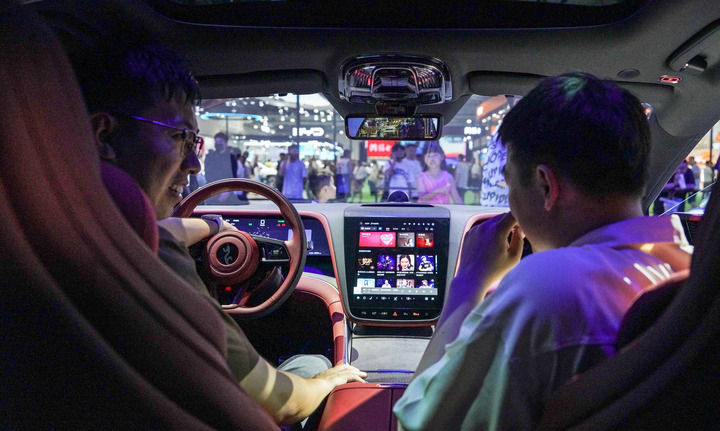 7月12日,游客在第22屆長春國際汽車博覽會體驗智能駕駛系統。新華社記者 顏麟蘊 攝