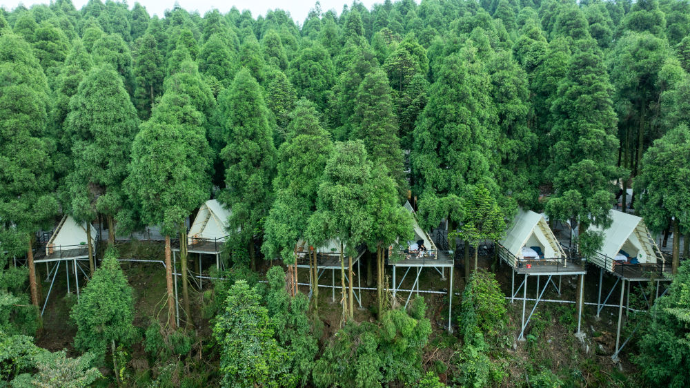 位于重慶東部的石柱土家族自治縣,七曜山脈穿插而過。這里有一條山脊背上的公路,因為雄奇險峻,被不少網友稱為“刀片天路”,成為不少騎行愛好者和攝影愛好者打卡的熱門選擇。于是,當地借勢打造了森林露營基地。