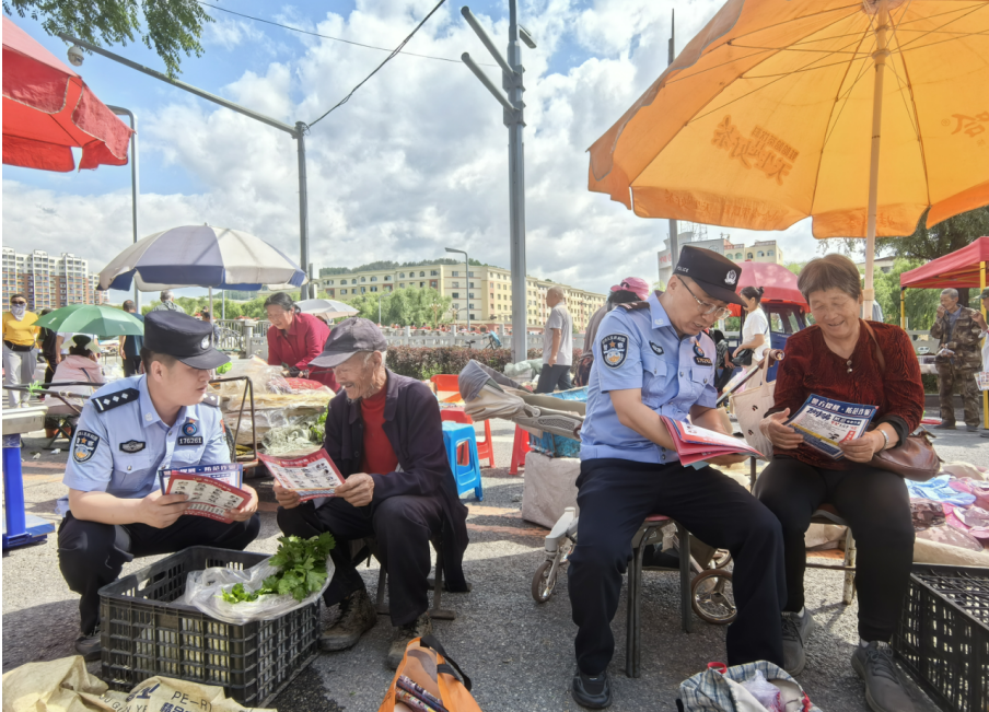 民警在臨江周末集市攤位向群眾開展普法宣傳工作。