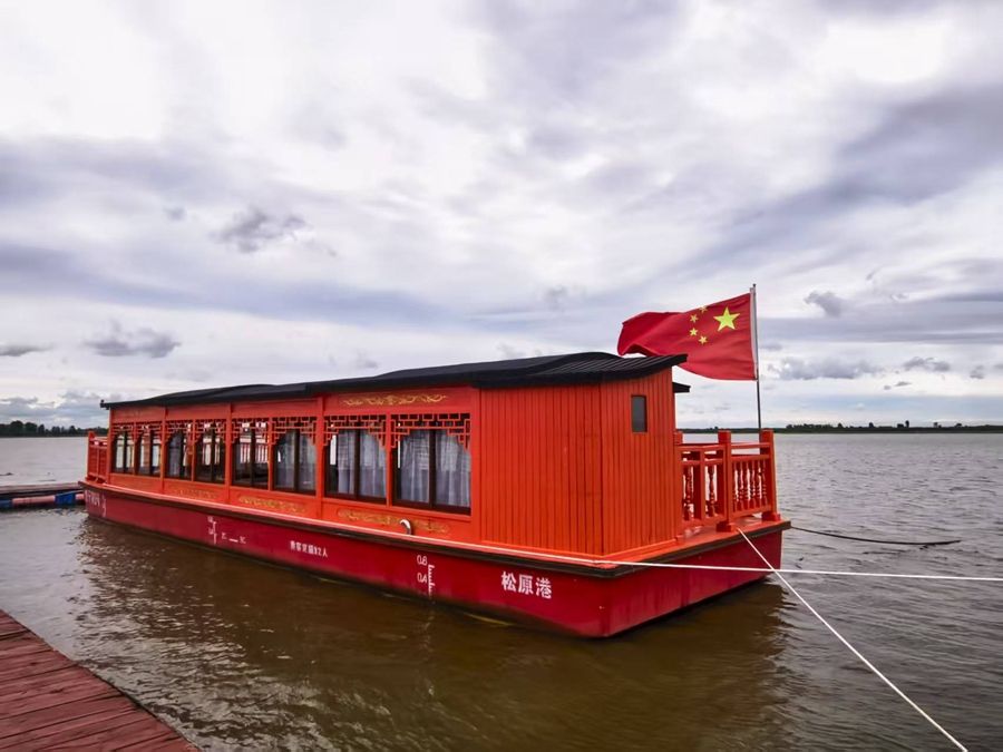7月20日,一艘游船停泊在查干湖水面上。