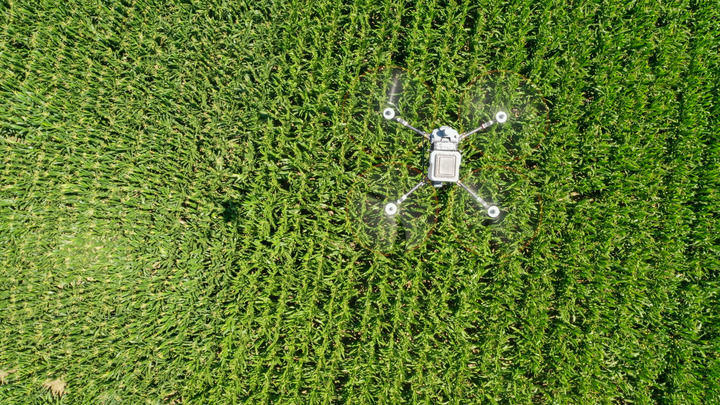 7月21日,在位于吉林省四平市梨樹縣的“科技小院”試驗田,植保無人機為玉米精準施肥(無人機拍攝)。