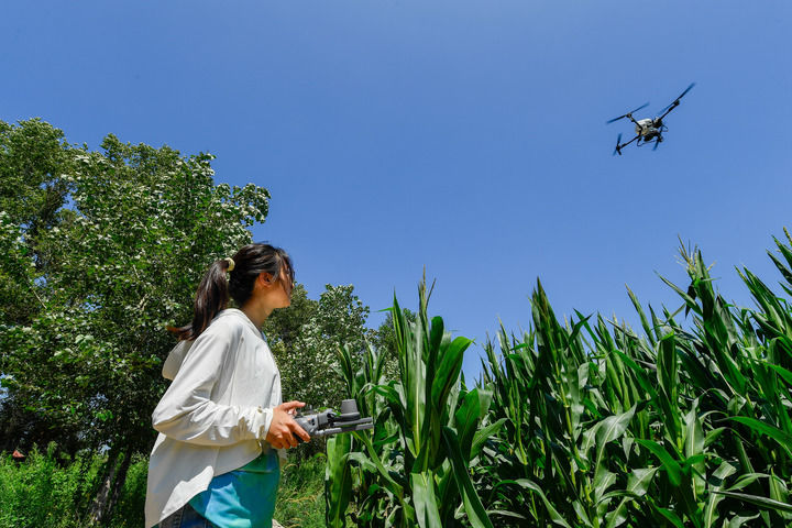 7月21日,在位于吉林省四平市梨樹縣的“科技小院”試驗田,中國農業大學學生黃怡操控植保無人機為玉米精準施肥。
