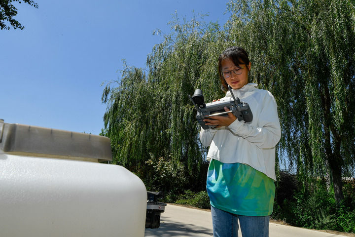 7月21日,在位于吉林省四平市梨樹縣的“科技小院”試驗田,中國農業大學學生黃怡調整植保無人機參數。