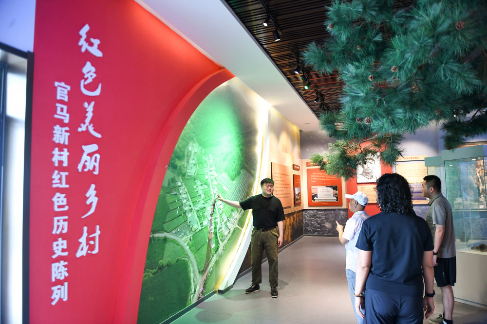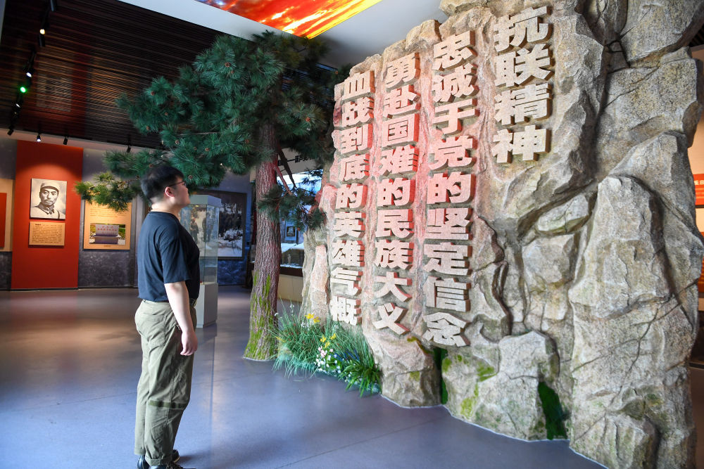 ↑ 8月11日,在磐石市官馬新村紅色歷史陳列館,馬鋮明(左一)為游客介紹抗聯歷史。