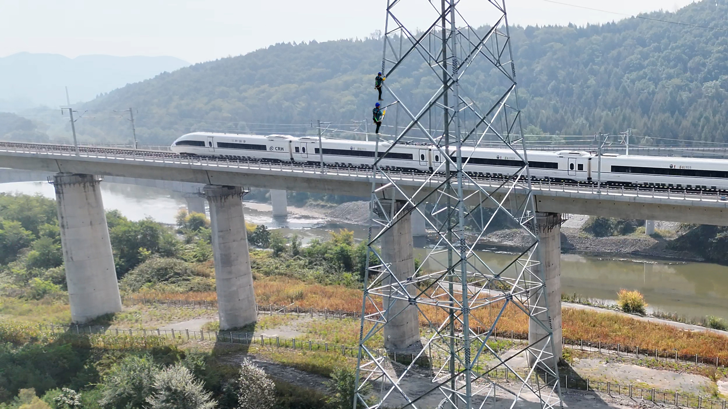 “今天高鐵正式通車,這段線路巡視時沒有使用無人機,而是采用人工登塔的方式檢查,重點檢查在線監測系統可能存在的死角?!睆堄詈澜榻B。