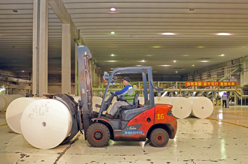 工人駕駛叉車將待切母輥豎起碼垛
