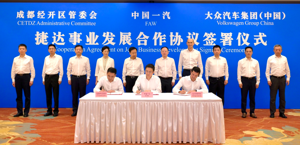 ▲中國一汽、大眾汽車集團(中國)、成都經開區管委會在成都簽署《捷達事業發展合作協議》